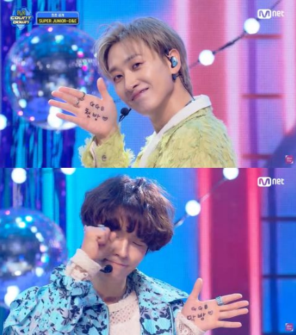 好消息是,改了歌词后D&E总算有机会站上音放舞台,昨(18)日登上Mnet《M Countdown》,成为他们第一个也是最后一个〈GGB〉音放表演。D&E在Ending时,银赫手上写了GGB初放,东海则写上GGB末放并做哭哭Pose,逗趣却也令人伤感。