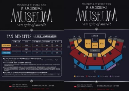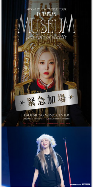 4月7日 (日)首站在台北国际会议中心(TICC)登场,现场带来多首热门歌曲,嗨翻全场粉丝,最后更是下台和粉丝互动,活动现场承诺粉丝表示之后我用中文做首歌好了,报答粉丝的爱。3月同时开卖 4 月 7 日 (日) 台北和 5 月 4 日 (六)高雄《Moon Byul 1ST WORLD TOUR [MUSEUM : an epic of starlit]》演唱会门票,一开卖后即全部完售,为了感谢粉丝的支持,宣布将加开一场 5 月 5 日(日)在高雄流行音乐中心,演唱会门票将於 4 月 23 日(二) 晚上 7 点在 KKTIX 网站开卖,全场实名制购票,演唱会票价为 NT$5,600 / NT$4,600 / NT$3,600 / NT$2,800,凡於 4 月 28 日(二)前购票者,有机会在 5 月 2 日(四)使用一元加购 1:1 合照、观看彩排、会后欢送、1:10 团体合照、亲笔签名海报等福利。MOO MOO们务必把握最后机会。