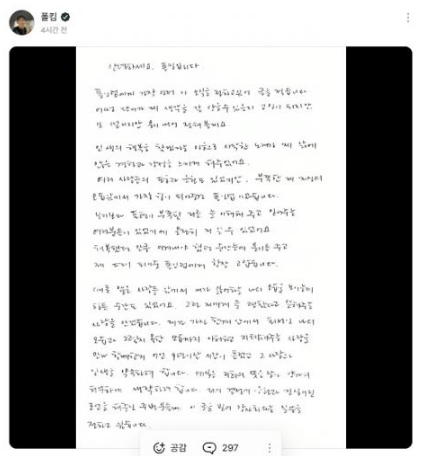 Paul Kim於官网发表手写信,表示在仍有所不足的自己面前,总是有粉丝Paul in Love长期的支持、给予自己力量与勇气,让他相当幸福。而有些时候会在大众面前露出自己也讨厌的模样,也曾有过不少艰难瞬间,不过遇到了对他说没关系的人、理解并支撑他所有模样的人,不知不觉经过了9年的时间,想和她约定人生。