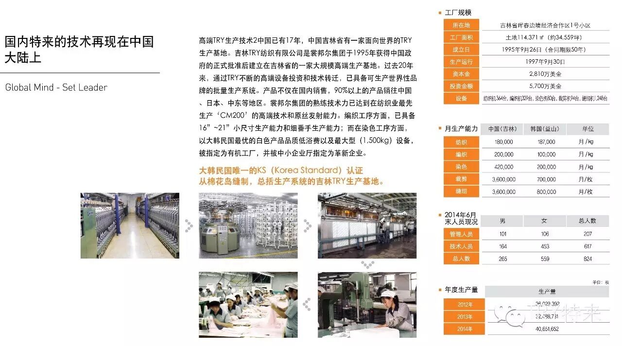 1996年则在中国吉林、延吉、图们等地设立3初现地法人及工厂,从而打下坚实的海外生产基础的同时,为内衣产业的海外市场进军迈出了第一步。而基于中国 和国内互联网销售渠道持续展开的核心力量的强化,则已带来创造性的技术发展,本公司以此创出了生产棉支数为140和160的世界最高水平内衣的成果。