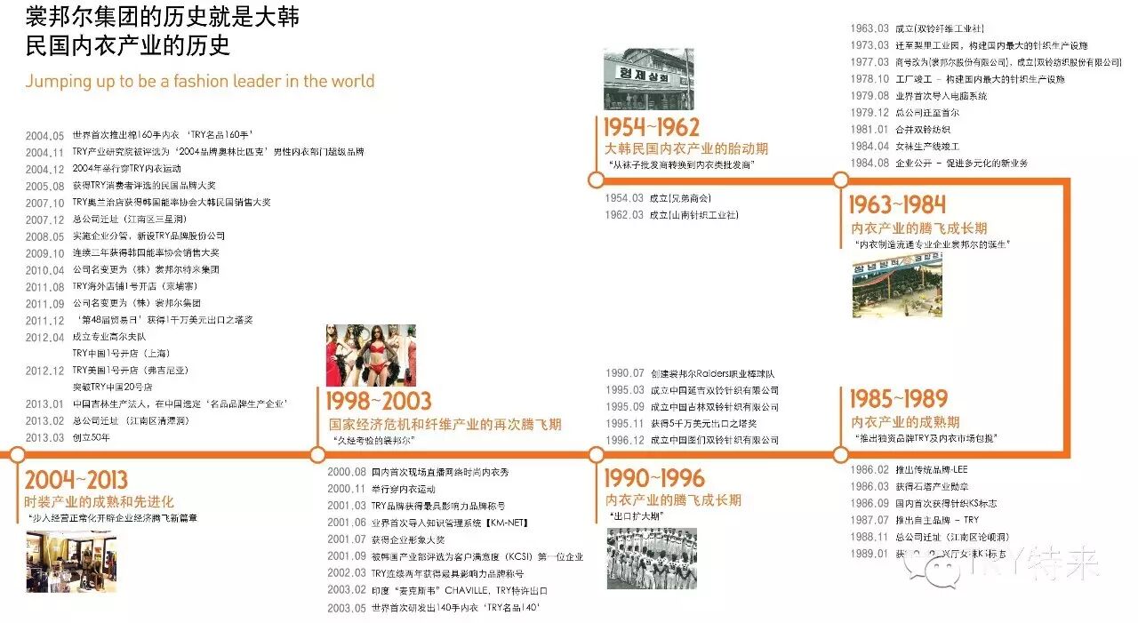 (株)裳邦尔特来集团自成立以来,一直致力于国内内衣技术的研发。1984年引进美国、Jockey 的先进技术,1987年推出TRY自主品牌之后,已成长为占最高市场份额的内衣品牌,为韩国内衣产业的时尚化和先进化做出了应尽的贡献。