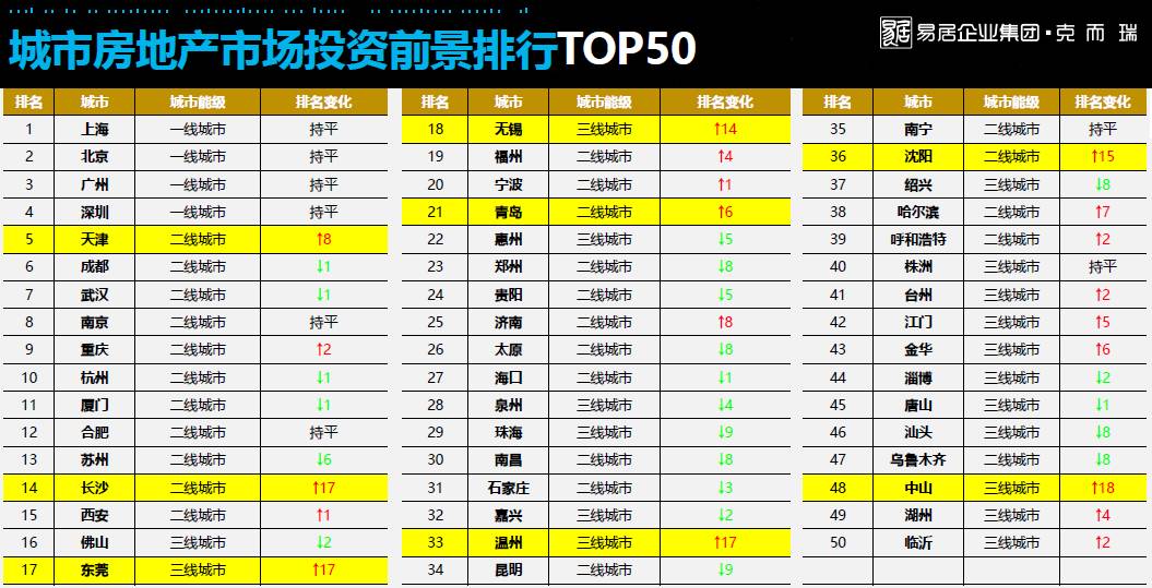 1、三大经济区即京津冀、长三角、珠三角,集中度持续上升。TOP50城市拥有全国32%常住人口,集中了房地产开发投资的的62%,商品住宅成交面积全国占比为46%,成交金额占比64%。另外一方面,对比去年的位次可以看到,规模化城市中,二线城市在往一点五线冲。而备受关注的三四线,名次变化也非常明显。