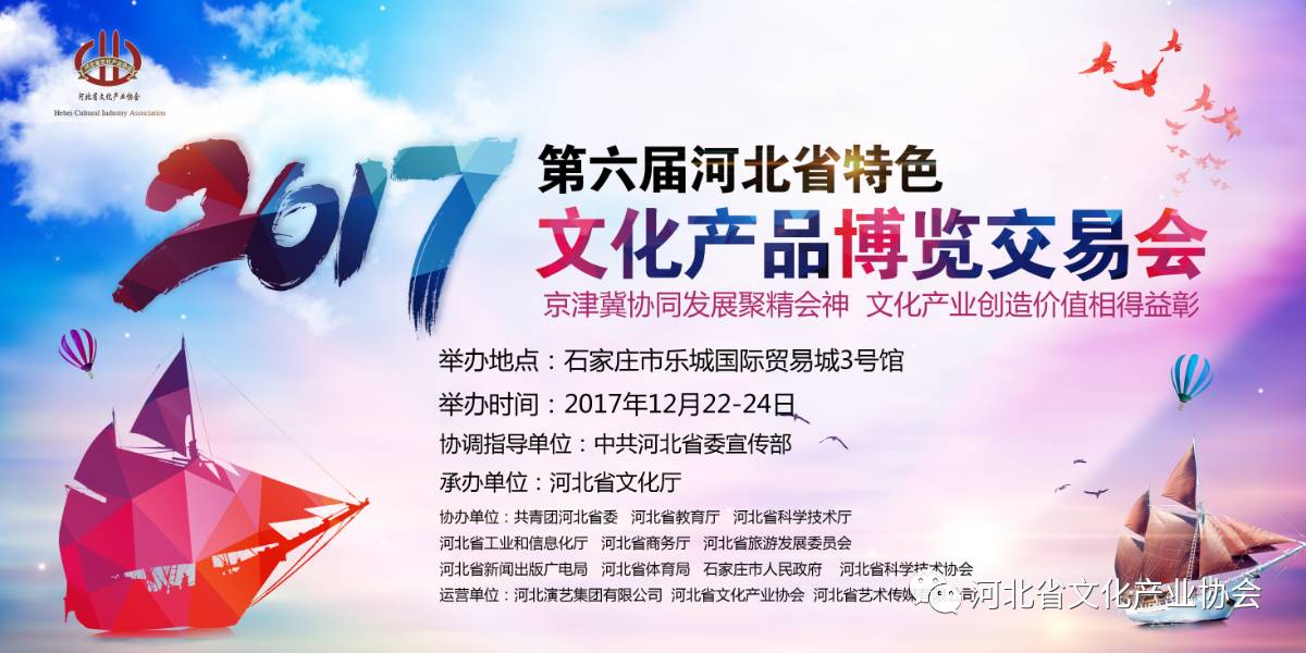 河北省最具规模和影响力的文化产业盛会—第六届河北省特色文化产品博览交易会将于2017年12月22日至24日在石家庄乐城国际贸易城举办。本届特博会将主打文化精品展区,以文化为依托,促进相关产业发展。荟萃京津冀区域特色文化,打造京津冀三地文化精品展区,促进京津冀协同发展。同时还将规划各类文化精品展区,是我省举办的一次高规格、高层次、大规模的文化产业盛会。
