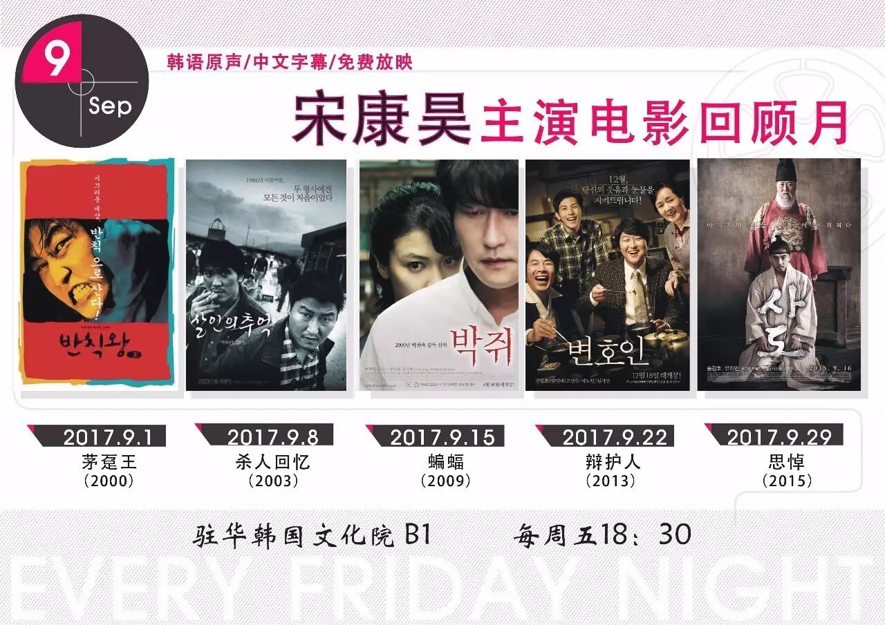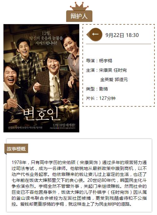 本周五(9月22日)18:30将放映由宋康昊联袂任时完、金英爱、郭道元主演的电影《辩护人》。影片采用韩语原声,并配有中文字幕,免费放映,无需预约。放映地点在地下一层演出厅,希望在周五为您送上精彩的观影体验!