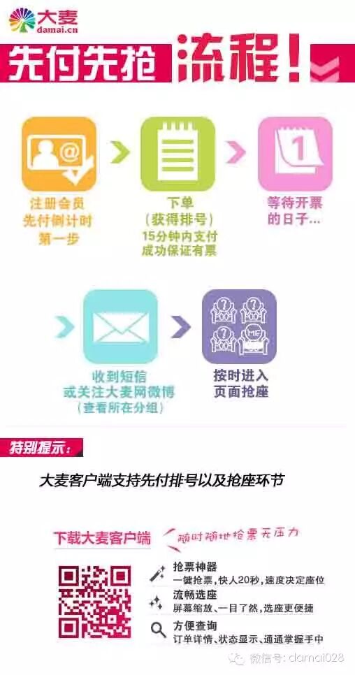 先付先抢:付款成功后每人将获得排号,能够得到在正式开票前根据排号优先选择座位的超级特权。